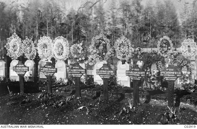 He is buried in the Vevey (St Martin’s) Cemetery in Switzerland where a number of Commonwealth soldiers, who died in captivity, lie buried. The original grave was marked with a wooden cross which was later changed to a stone headstone. From the photograph of the original grave we see that he was not alone and perhaps a number of allied service men suffered the same illness and result (Death Certificate number 1918/24387).
