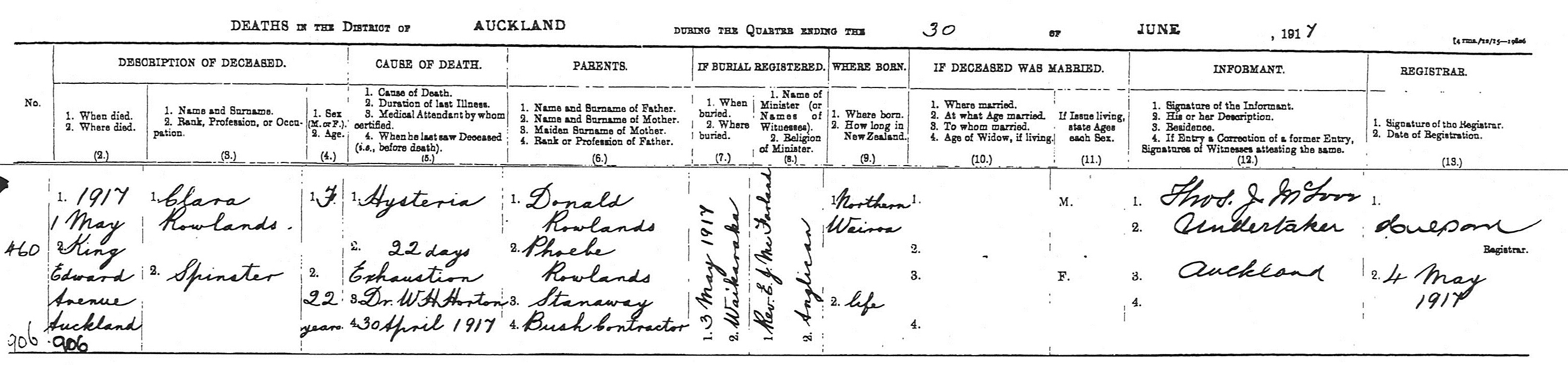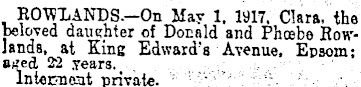 Rowlands – On may 1, 1917, Clara, the beloved daughter of Donald and Phoebe Rowlands, at King Edward’s Avenue, Epsom aged 22 years – Internment private.