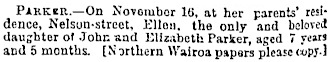 PARKER – On November 16, at her parents residence, Nelson Street, Ellen, the only and beloved daughter of John and Elizabeth Parker, aged 7 years and 5 months. [Northern Wairoa papers please copy].