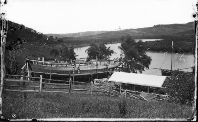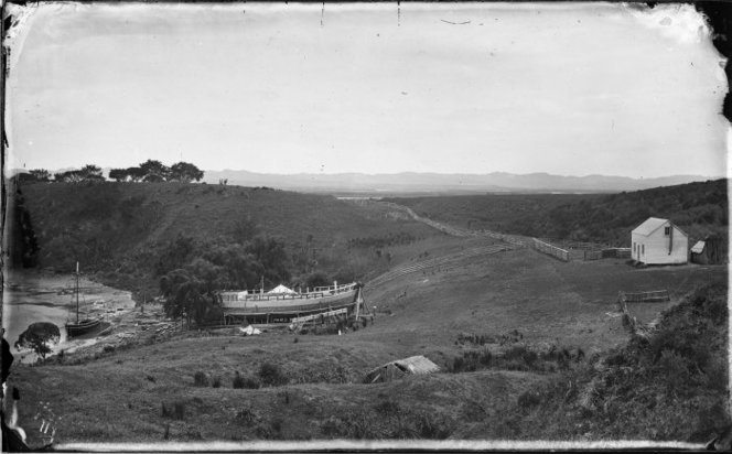 Schooner Lotus, under construction at Wakatiwai by Charles Simcock for William Bonar, timber miller, of Kaukapakapa, photographed in late 1863 by Daniel Manders Beere. The Lotus was wrecked at Kaipara Heads on 13 August, 1864.