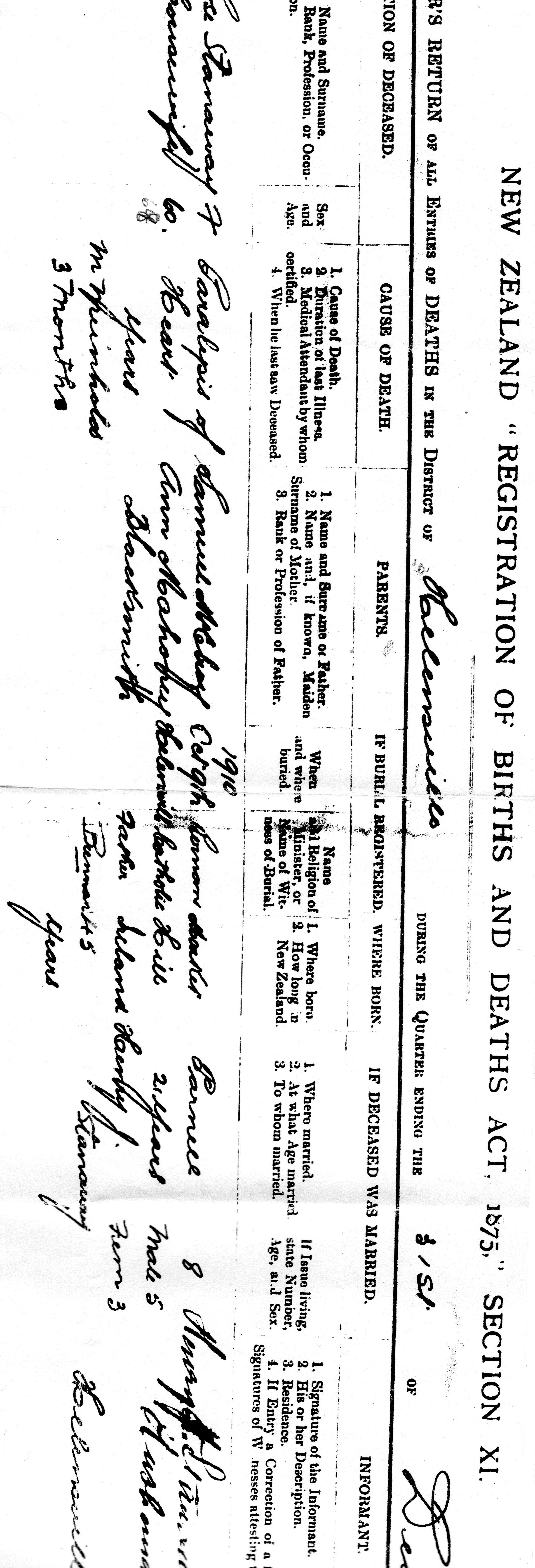 “One of Helensville’s pioneer settlers and one of the best known master mariners in the Kaipara passed away last Saturday night in Henry Joseph Stanaway. The deceased had not been very well for some time past, and died as above stated owing to pleurisy and a weak heart.