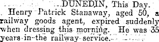 Dunedin, This Day. Henry Patrick Stanaway, aged 50, a railway goods agent, expired suddenly when dressing this morning. He was 35 years in the railway service.