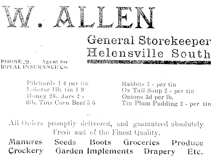 “A businessman, who, since 1906 had built a good reputation in Helensville, both as a grocer and as a courteous, public-spirited man, left Stewart Bros. store in 1919 and began in business on his own account at Helensville south. This man was Wilfred Allen and the grocery and general store he purchased, was that of Mr. Graham, on the north corner of Karaka Street and Commercial Road. This store had been built by J.A. Vercoe in 1903 for Mr. Hardy and had been owned by Mr. Masters before Mr. Graham’s time. When Mr Allen went into this shop, a verandah rimmed it on both frontages and a street light, one of the few in Helensville, stood on the corner and was maintained by the owner of the store. Mr. Allen’s staff consisted of his wife, her brother Jack Stanaway and her sister Eileen……. The ownership of this store included that of the old home of Charles Nelson on the same section, and by the late 1920’s Mr. Allen had made this house and grounds into one of the show places of Helensville with many trees, tennis courts and an aviary. Mr. Allen sold this grocery business in 1938 but conducted a store in Kumeu until 1961.”