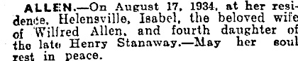 On 17 August 1934 Isabel passes away aged only 56 (Death Certificate Number 1934/14288), she is buried in the Helensville Cemetery, Block E3 Lot 78.