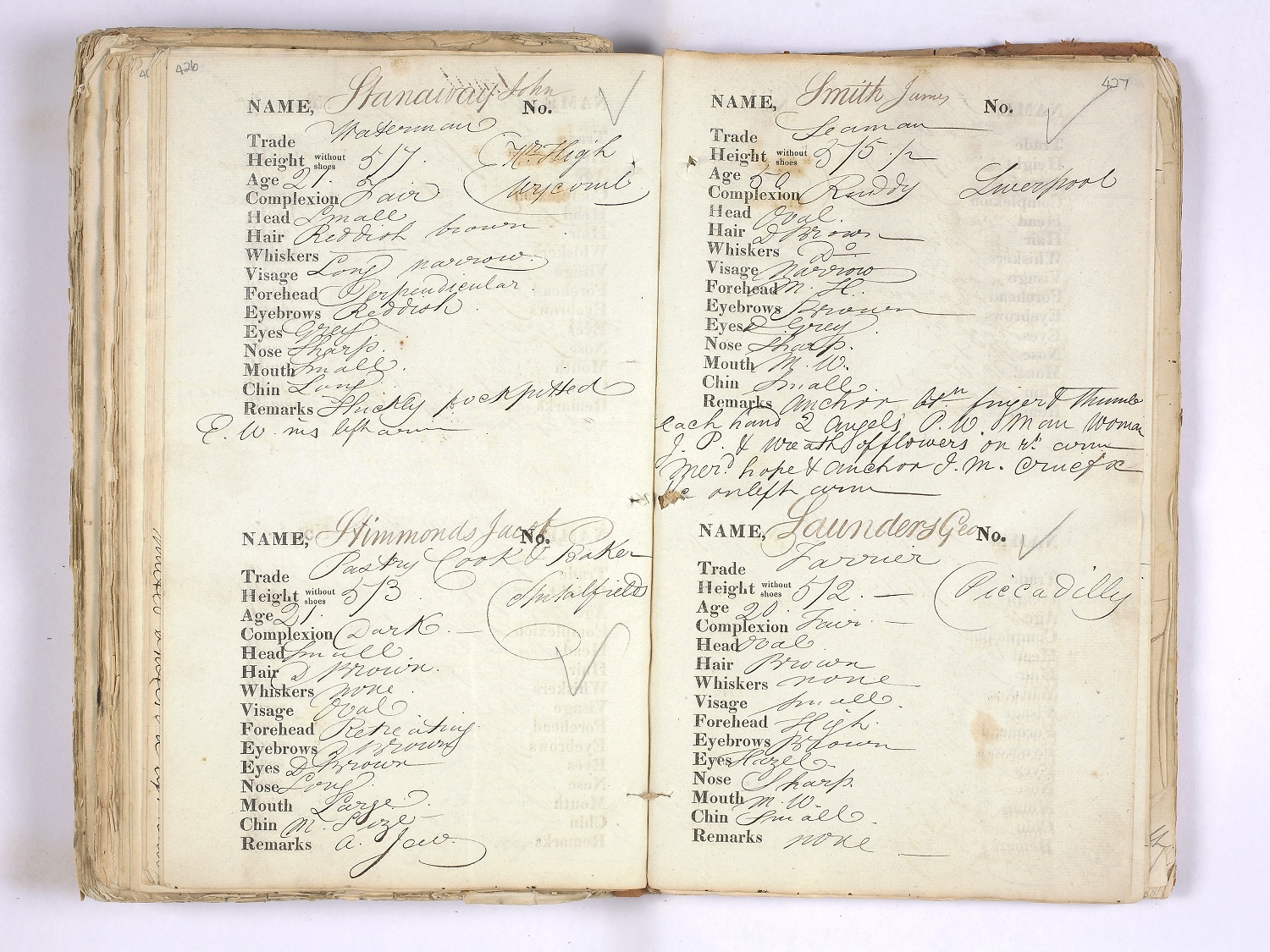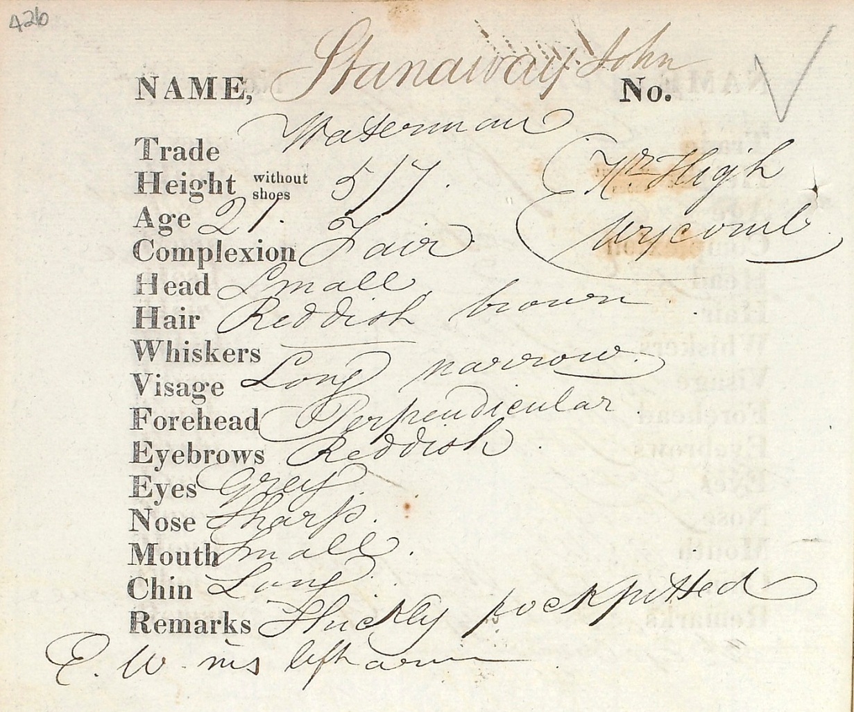Name: STANAWAY John – Trade: Waterman – Height (without shoes): 5/7 – Age: 21 – Complexion: Fair – Head: Small – Hair: Reddish Brown – Whiskers: – – Visage: Long narrow – Forehead: Perpendicular – Eyebrows: Reddish – Eyes: Grey – Nose: Sharp – Mouth: Small – Chin: Long – Remarks: Thickly pock pitted, E.W ins. left arm.
