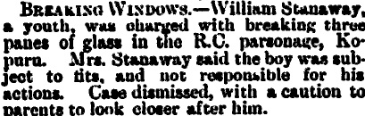 “Breaking Windows. – William Stanaway, a youth, was charged with breaking three panes of glass in the R.C. (Roman Catholic) parsonage, Kopuru. Mrs. Stanaway said the boy was subject to fits, and not responsible for his actions. Case dismissed, with a caution to parents to look closer after him.”
